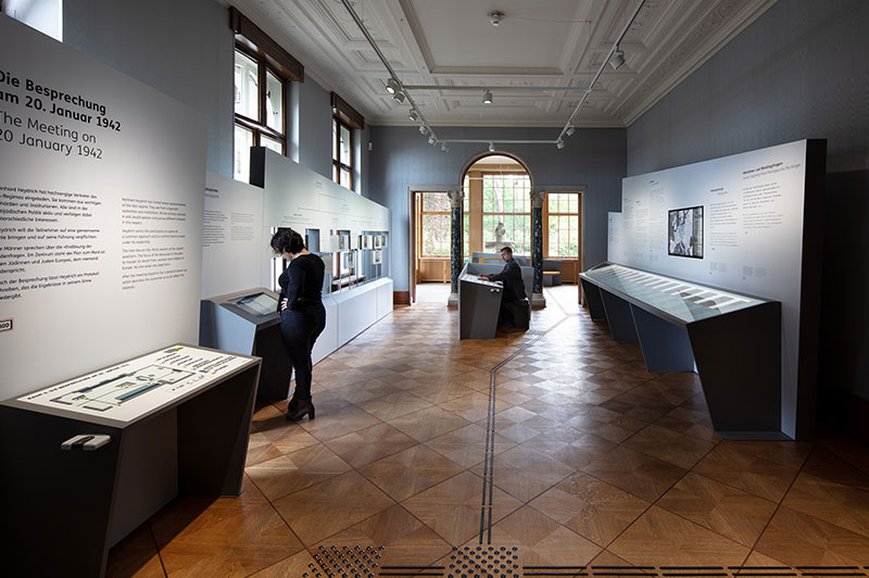 Einführung in unserer Dauerausstellung. Die Ausstellung klärt darüber auf, was Antisemitismus ist, wie er sich vor dem Massenmord entwickelt und was bis heute von ihm bleibt. Sie berichtet, was Jüdinnen und Juden aus verschiedenen europäischen Ländern erleben. Die Ausstellung fragt, was mit den Teilnehmern der Besprechung nach 1945 geschieht, und wie die Gesellschaft über ihr Handeln im Nationalsozialismus nach 1945 denkt.